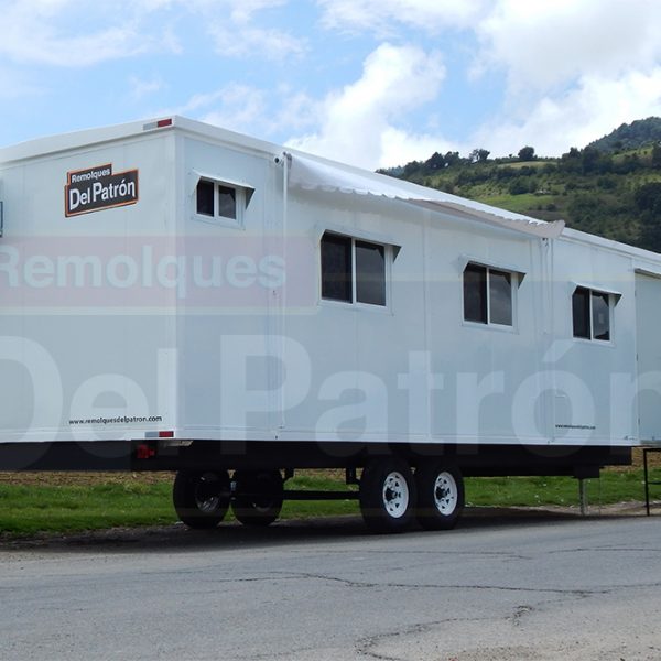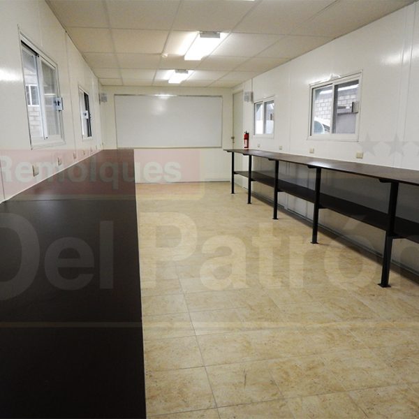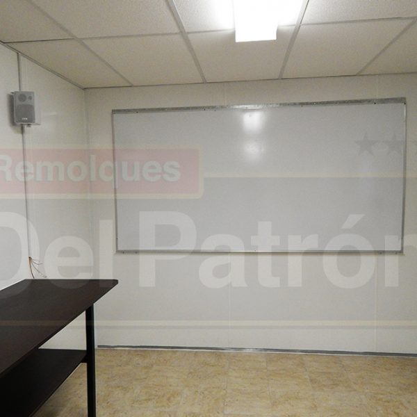 Aula móvil de 9.75m de largo, 3.05m de ancho, 2.30m de alto, para capacitación, con iluminación, contactos, pintarron y mesas de trabajo.
